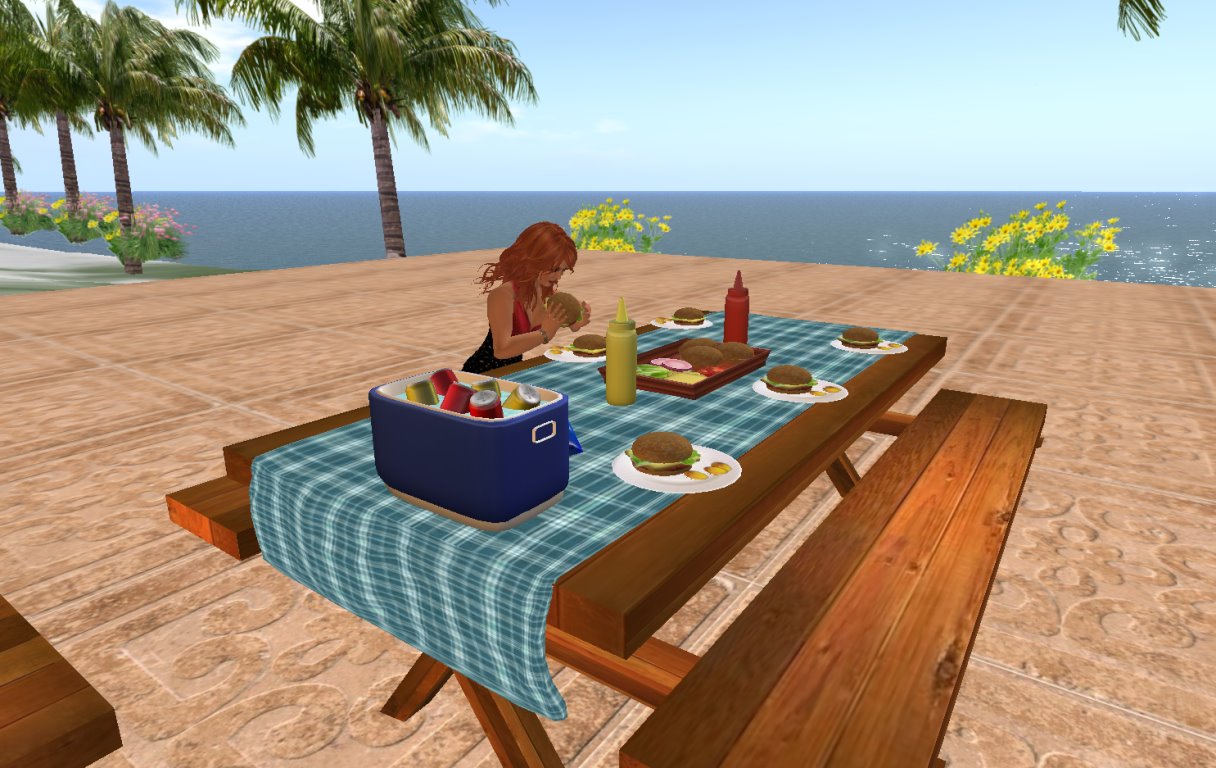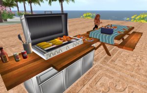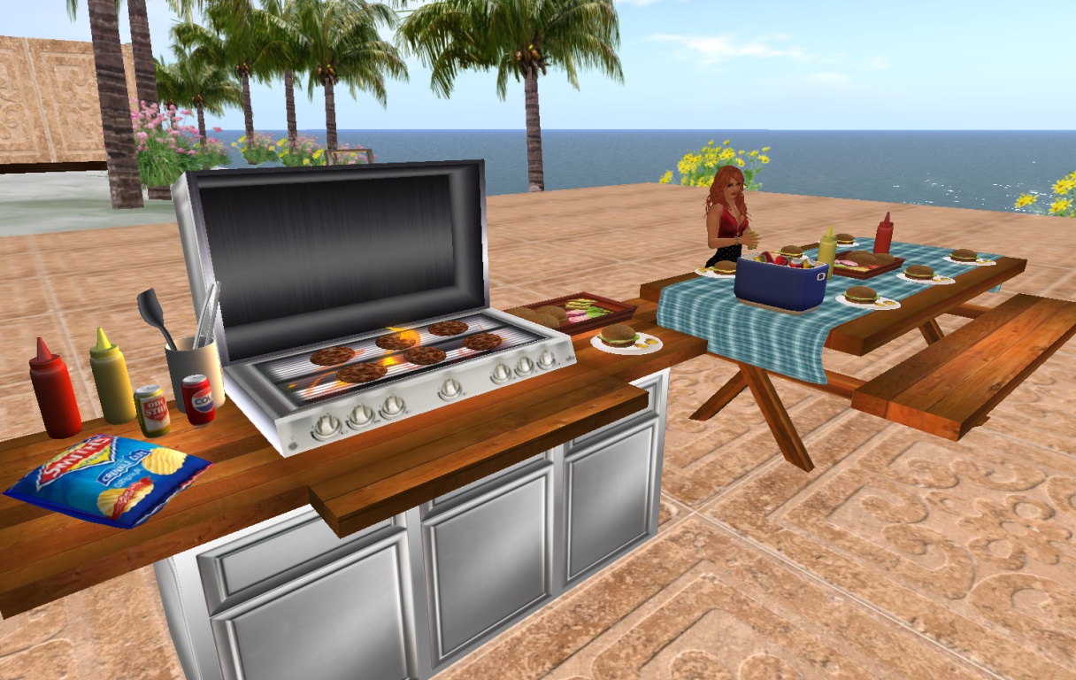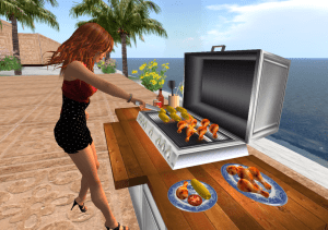 Touch the grill to get a menu to rez uncooked burgers or barbecued chicken — then after a bit, “turn” the meat over by rezzing the cooked versions!