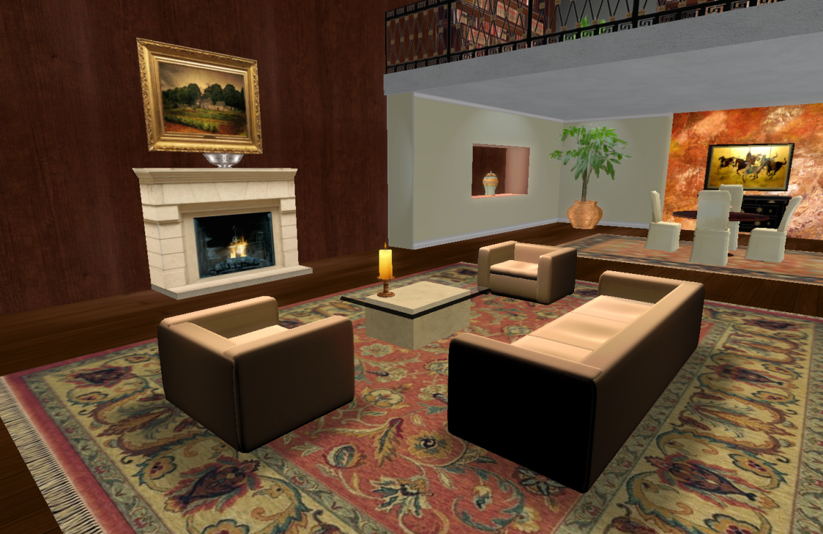 The cabin has low ceilings and dark paneling, so I covered the floors with wood, painted, and wallpapered. 🙂 And yes, that took some of my precious prims.