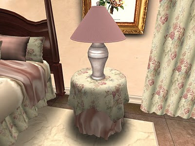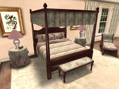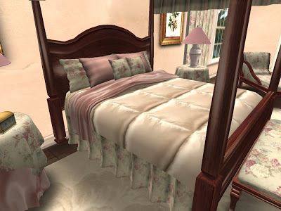 The lovely dusty rose and antique oak boudoir bench includes sit animations and the matching chaise includes a cuddle animation as well as sits. Check out the 5 prim matching curtains in the store.