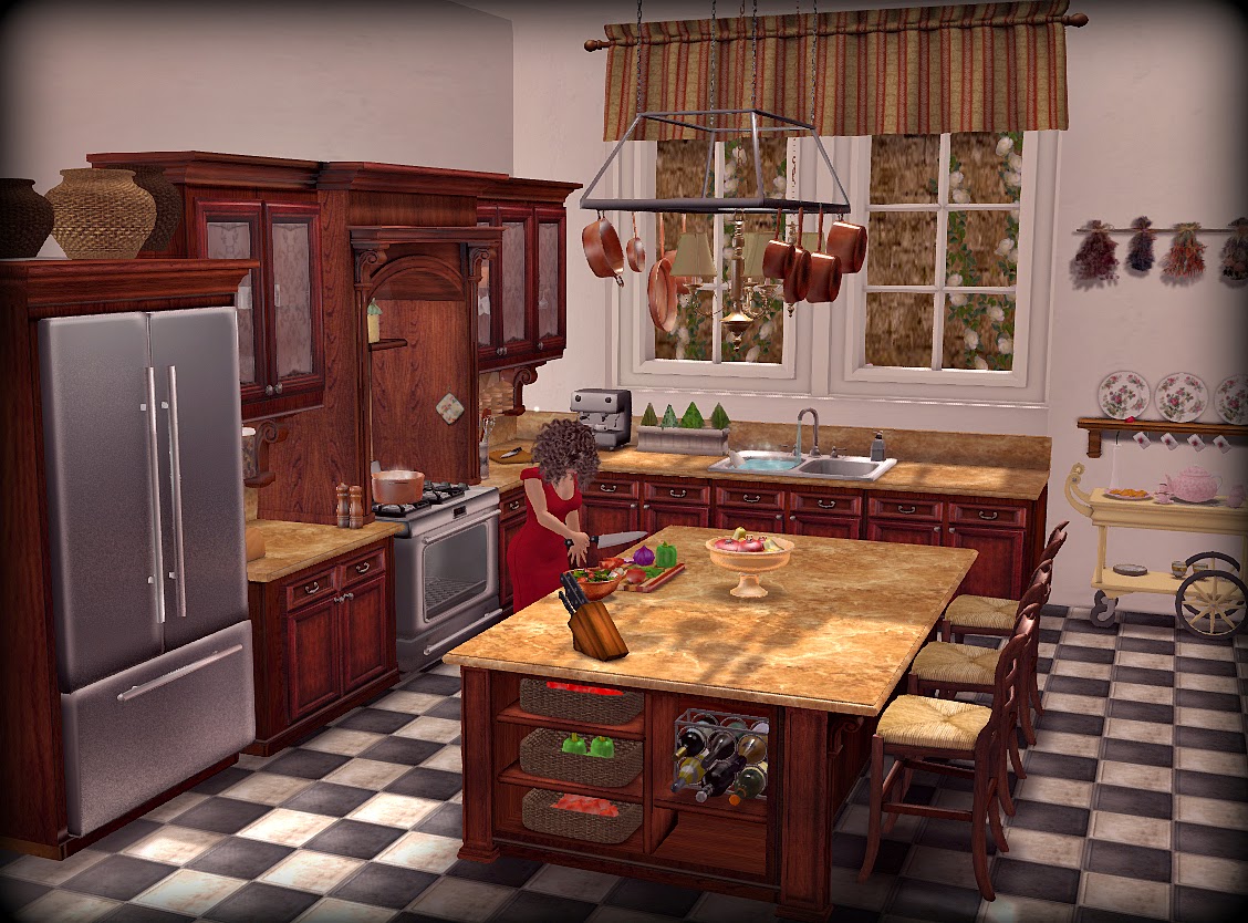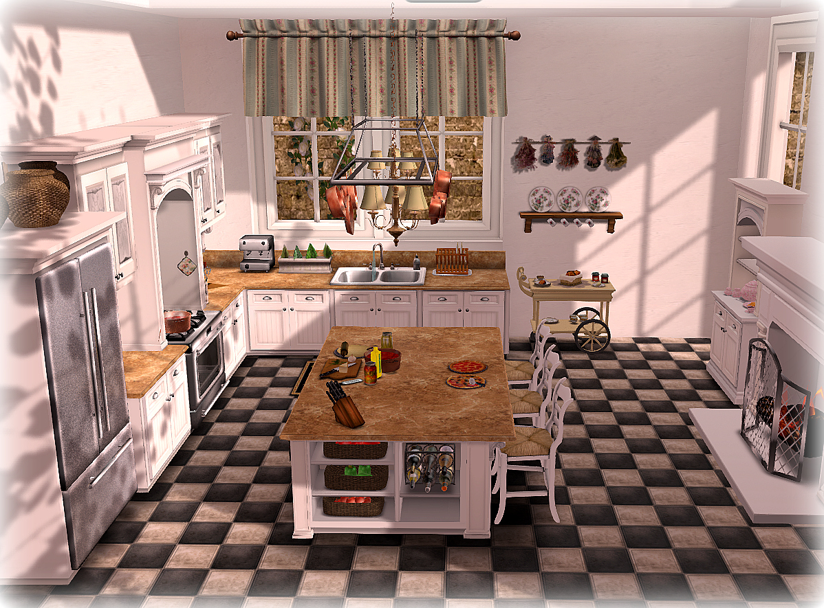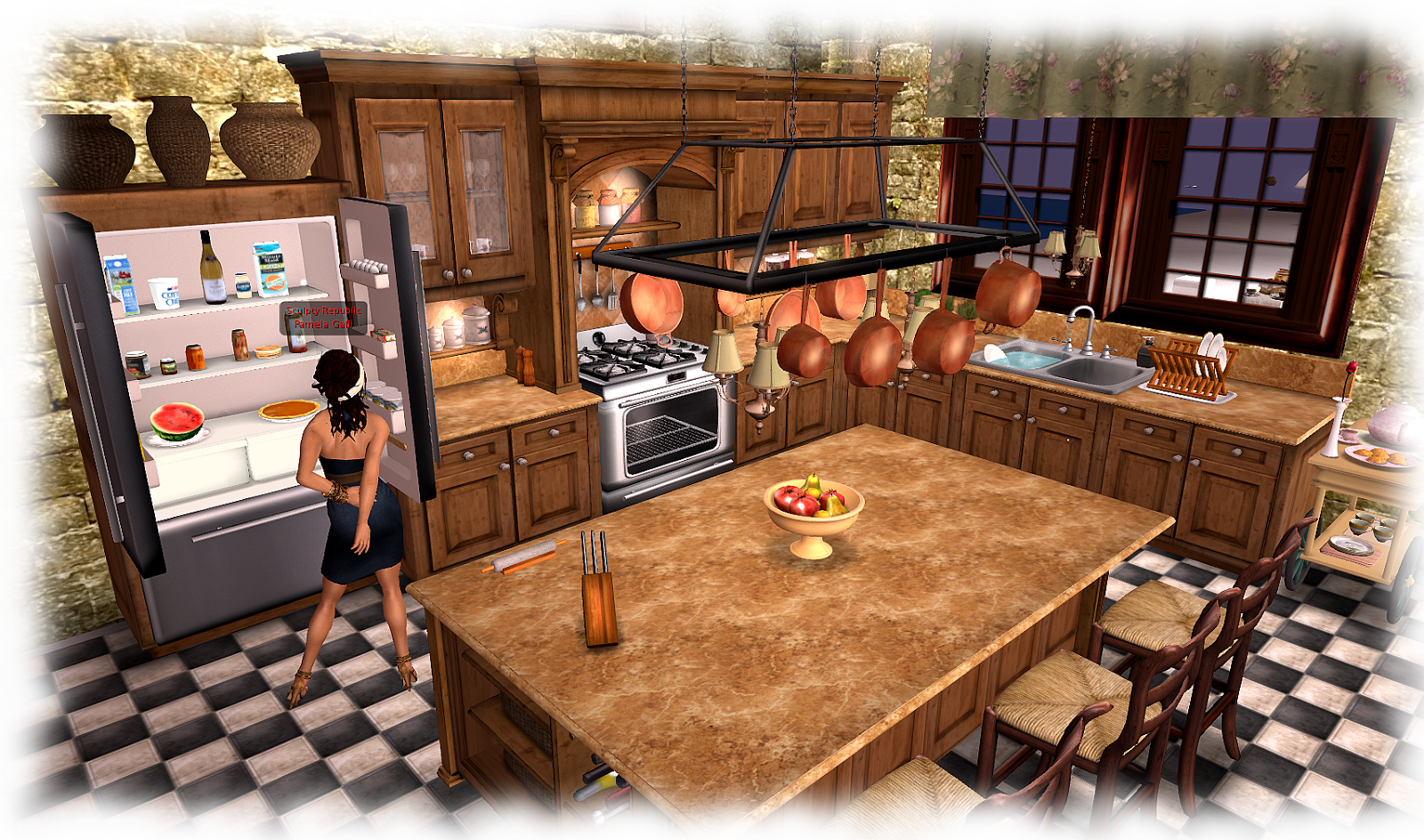 The kitchens come with two different countertop texture change versions* — Amber or Black Marble — are modular, easy to modify, and have many different accessories, so you can customize to your kitchen’s size and prim count. Refrigerators are not linked and can be placed at either end of the kitchen or elsewhere. Freestanding cabinets and fireplace (not visible in picture) are not linked so may be placed anywhere.