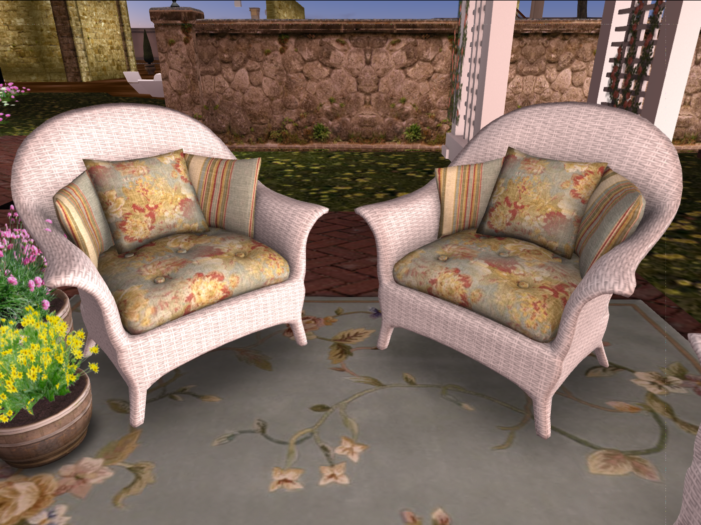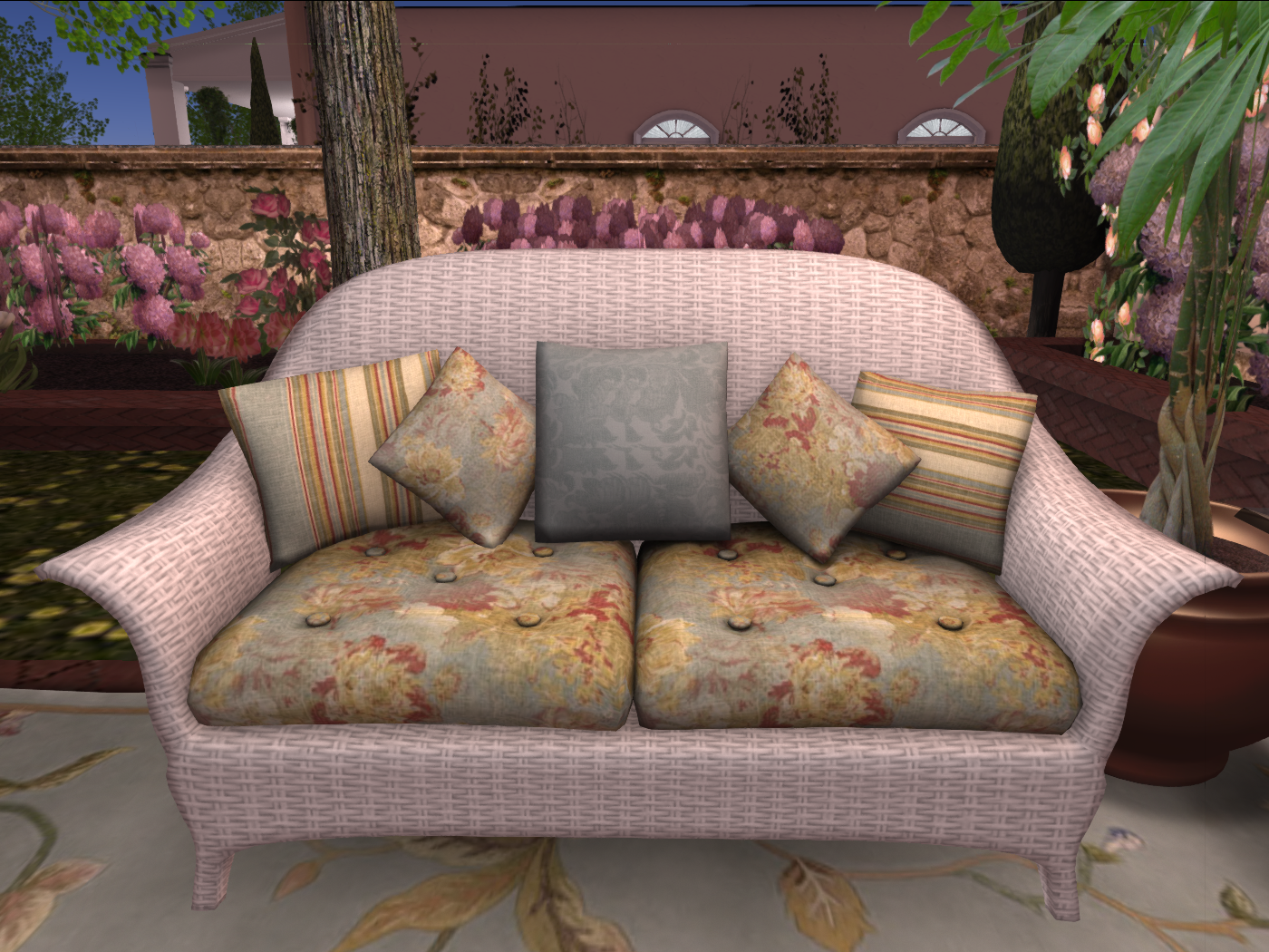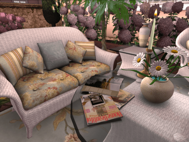 With plenty of seating and a coffee table that rezzes a variety of flowers, magazines, and appetizers for guests, this La Galleria Exclusive Set is the perfect addition to any patio or balcony. All this for 34 prims!