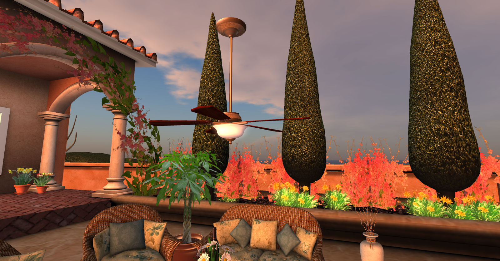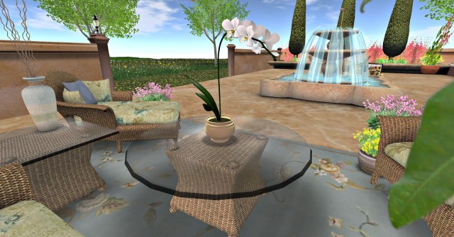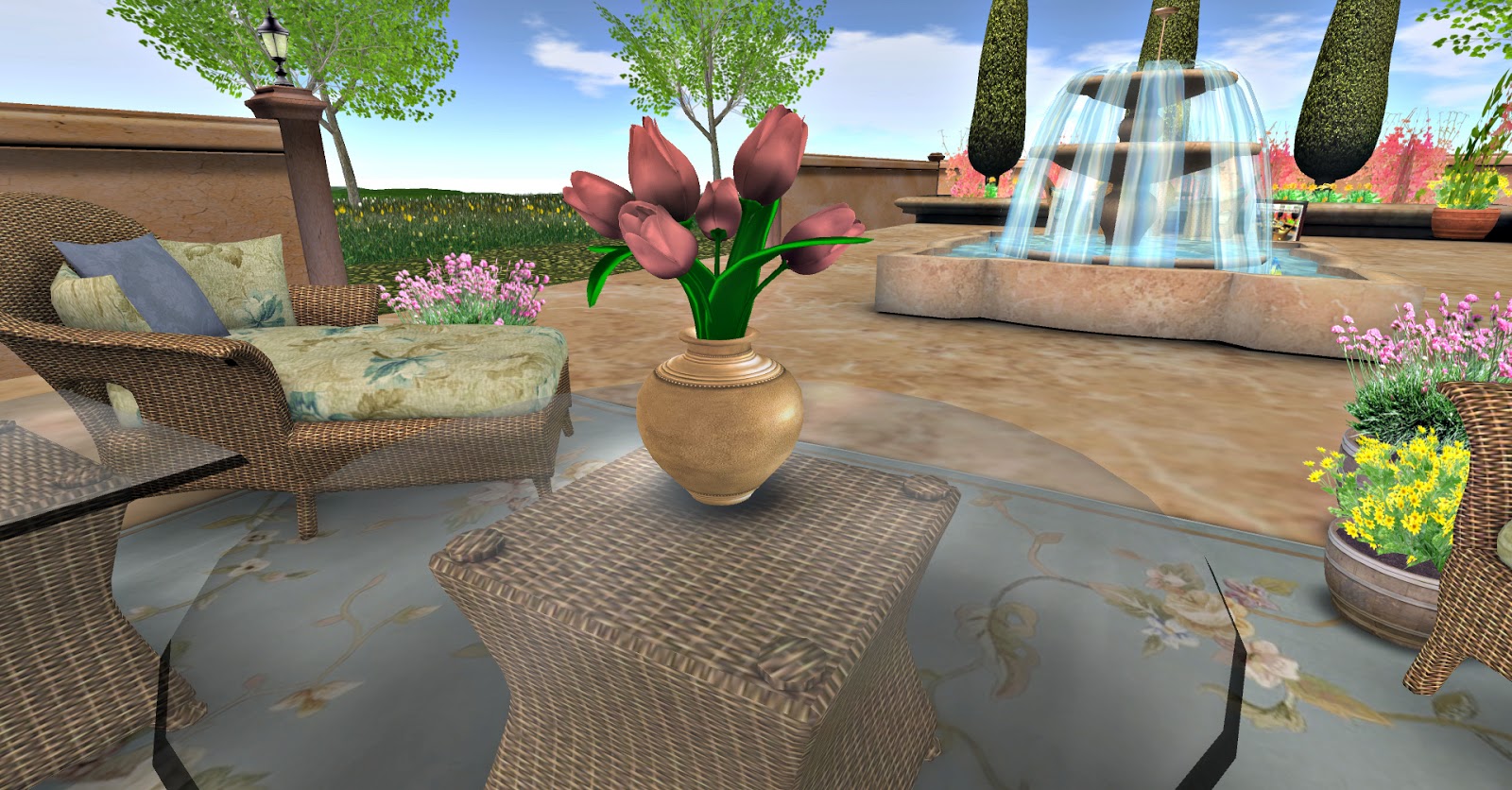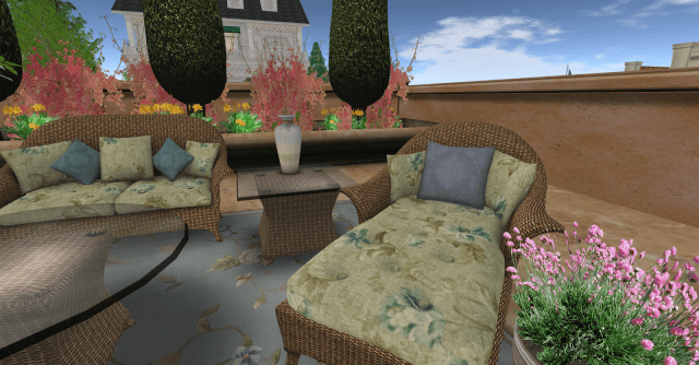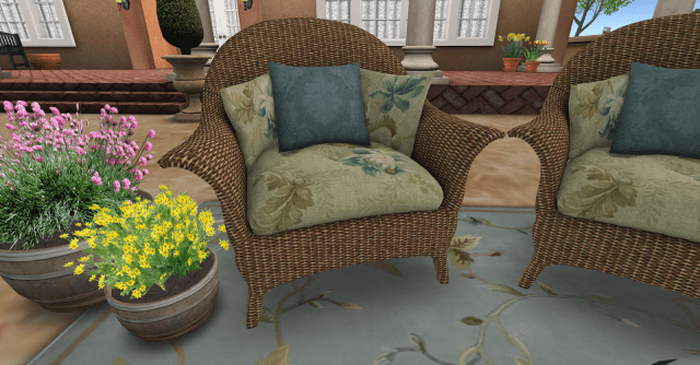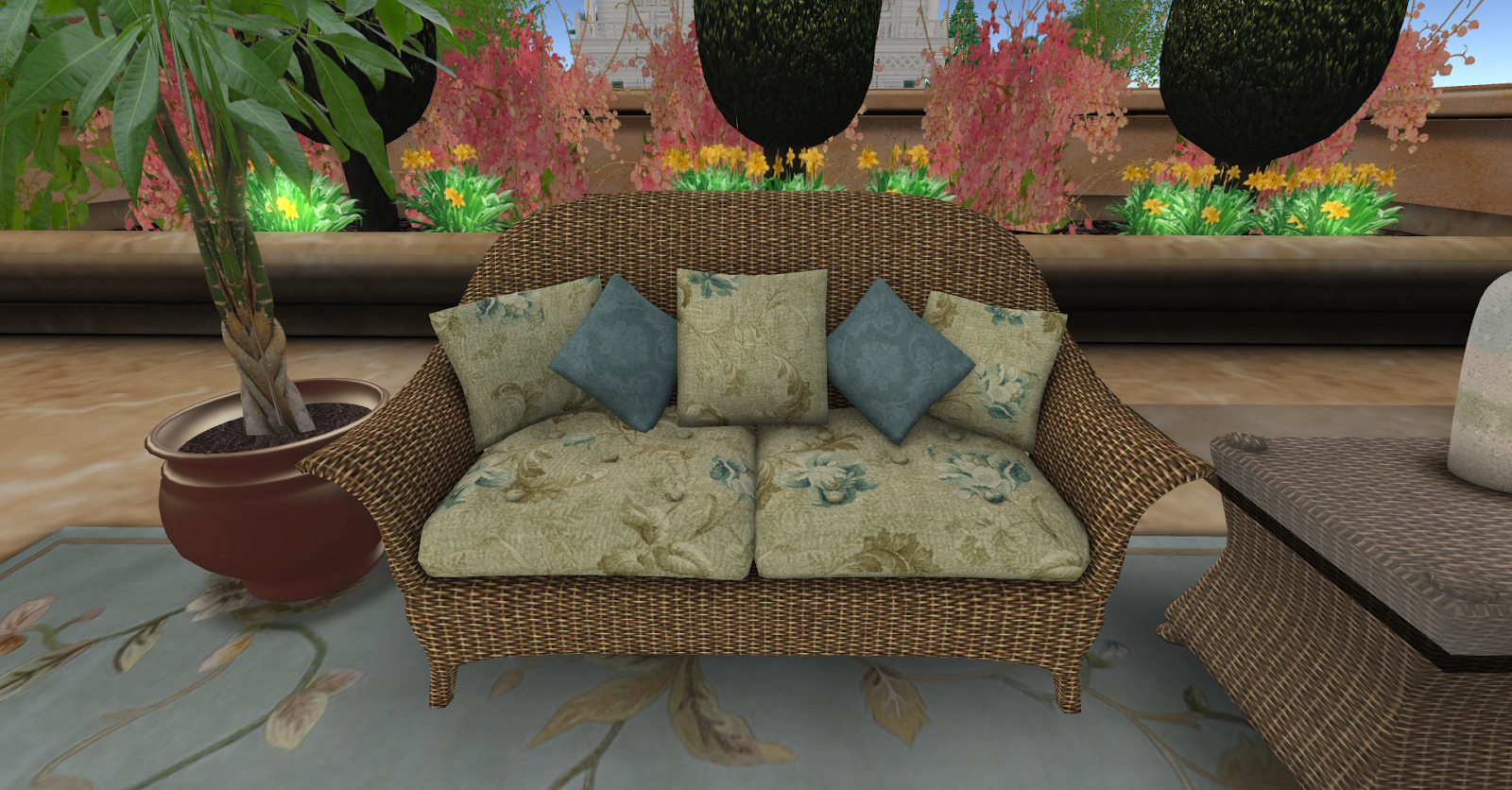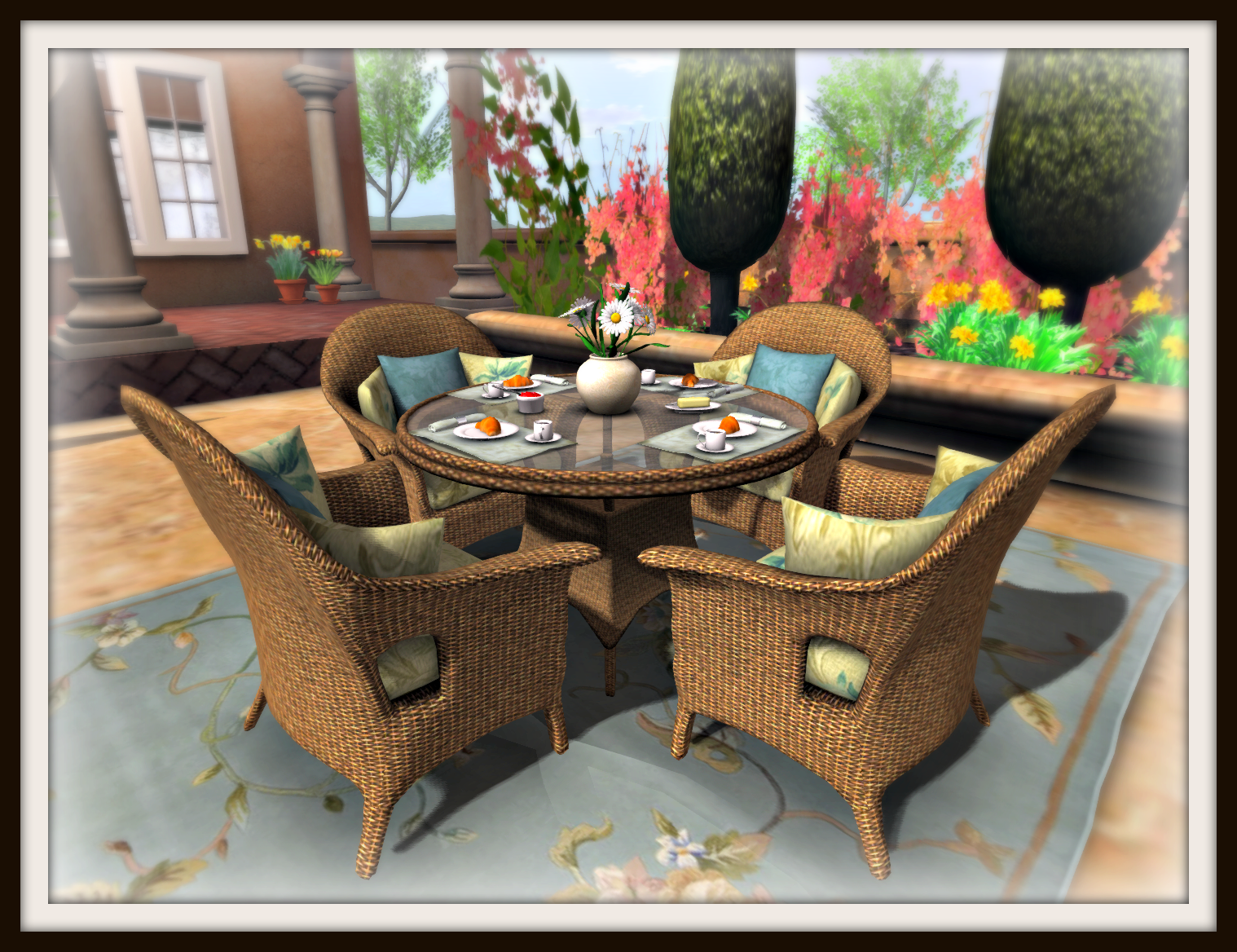 This Tan Wicker Set makes hosting a casual brunch or lunch effortless! This set has options for place seating for two or 4, and choice of muffins, waffles, croissant or sandwiches. Or, of you have decided to move to the living area (see below), clear the table and set with a pretty vase of flowers. All this for 17 Prims!