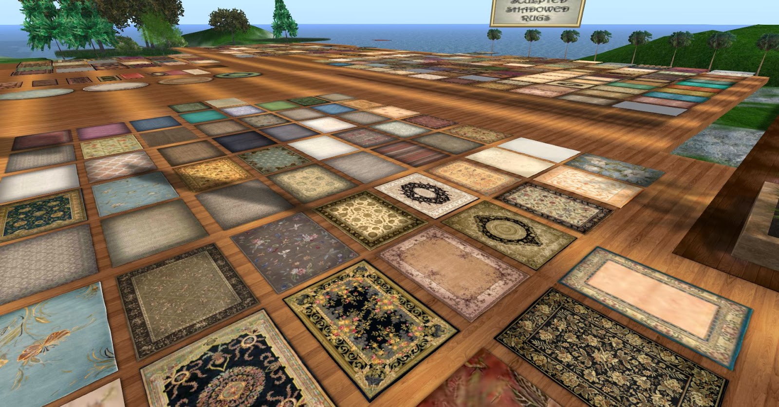 I have a new shipment of great looking high-resolution rugs, and have put all rugs in the rug department on sale, this week only. The new rugs are all mesh, with a shadow prim under them. They are pretty much the same as the sculpted rugs, but since the mesh ones are all one mesh, you can more easily stretch them to exactly the size you want.