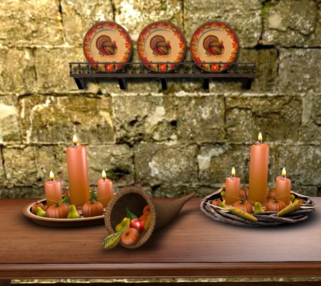 The turkey plates with mesh plate rail and the mesh 1 prim cornucopia are free! The centerpieces come in two styles, and each has two versions: one can be installed in La Galleria coffee tables, patio tables, console tables, kitchen islands; the other can be installed in Dinner Party brand tables.