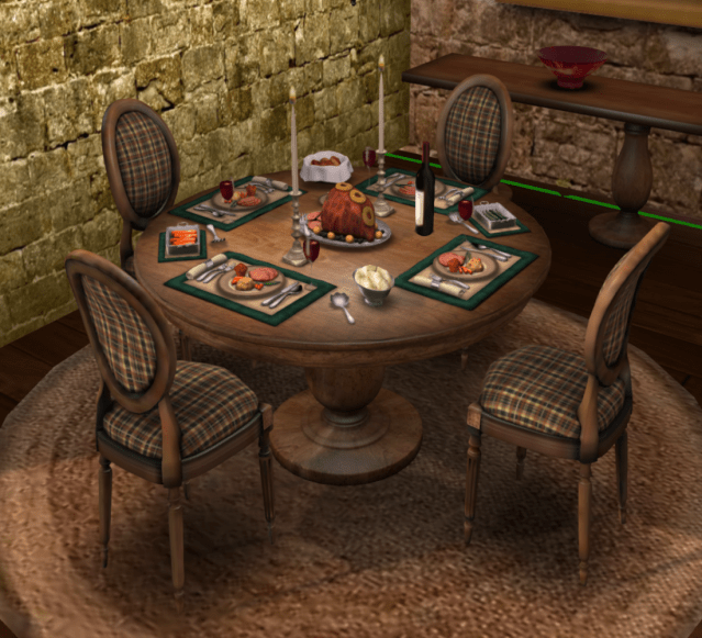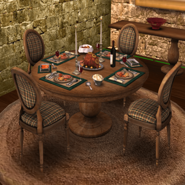 To get the 25% Mix n Match Discount, buy 5 pieces of dining furniture and send your transactions on a notecard to Turbokitty. Any accessories you include with the set will receive the discount as well.