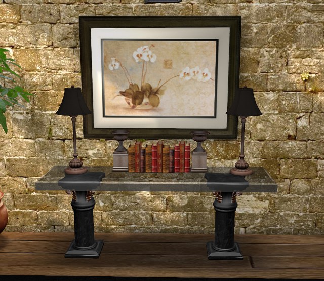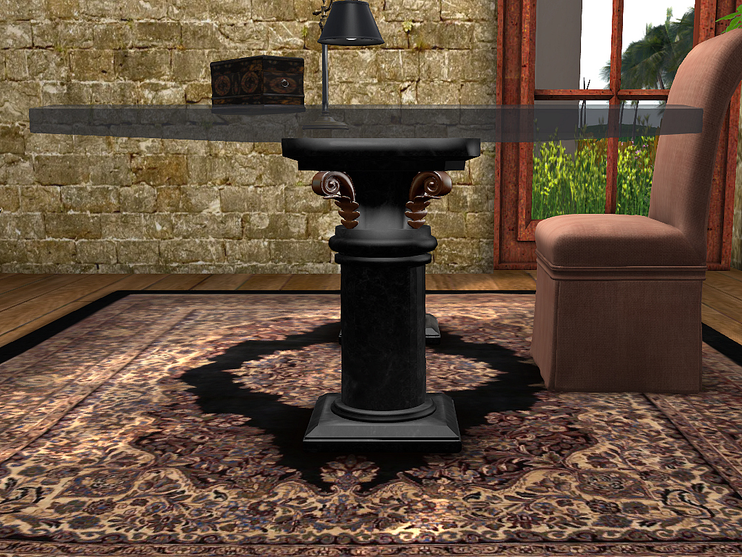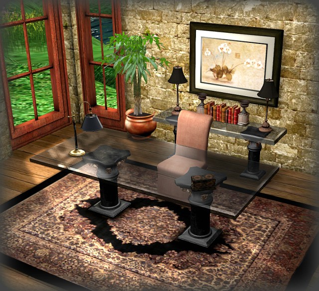 I really like this week’s new release- the Black Marble and Glass Office Set. It has the perfect blend of classic and contemporary style, and it is only 24 prims! The included items are a mix of both transfer and copy, and the writing table rezzes desktop items from a menu. It can be found Inworld or on the Marketplace.