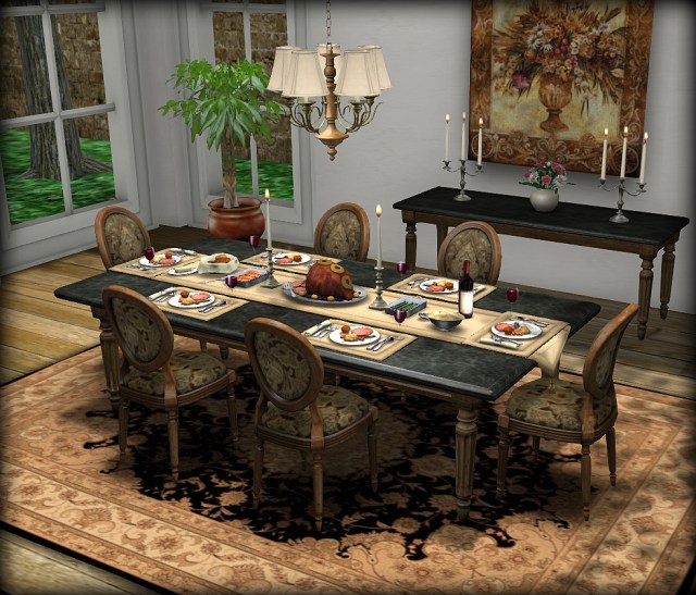 This dinner table will serve a lasagna, shrimp, steak or ham dinner with a glass of red wine, fried chicken with iced tea, eggs, bacon, and croissant, and for desert a round of cheesecake and coffee. When not serving, rez a variety of centerpieces.