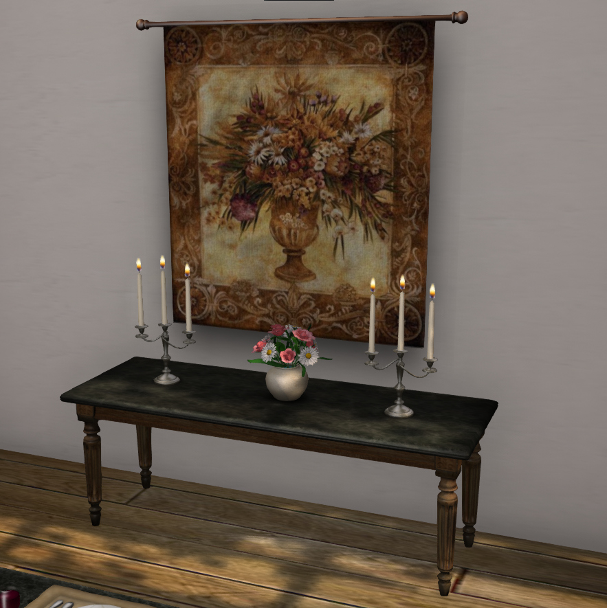 This new Dinner Party Set only has 42 prims! Everything is mod and transfer except for the items that rez from a menu, which are copy; you cannot transfer those pieces of furniture unless all the items are deleted from contents.