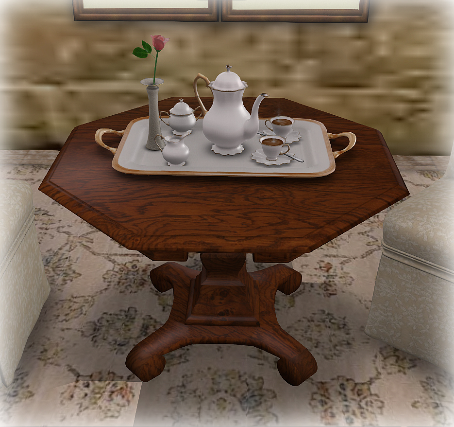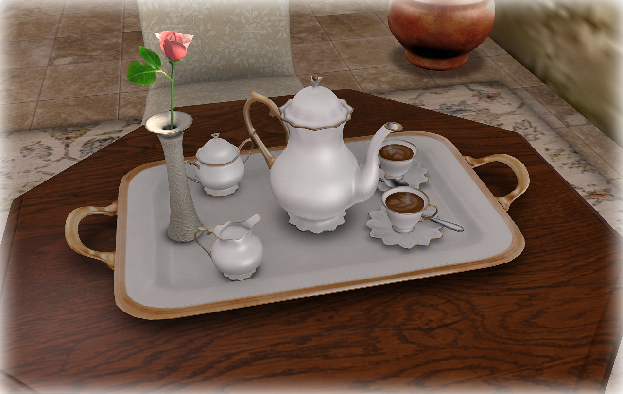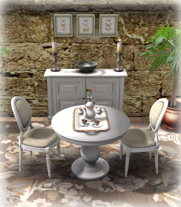 This week I’m releasing three different tables for two that rez a coffee set or vase of daisies and roses. Enjoy your morning or after dinner coffee with someone special. Perfect for a terrace or bedroom nook! All for 3 or 4 prims each! Copy/Mod. Found at the landing point