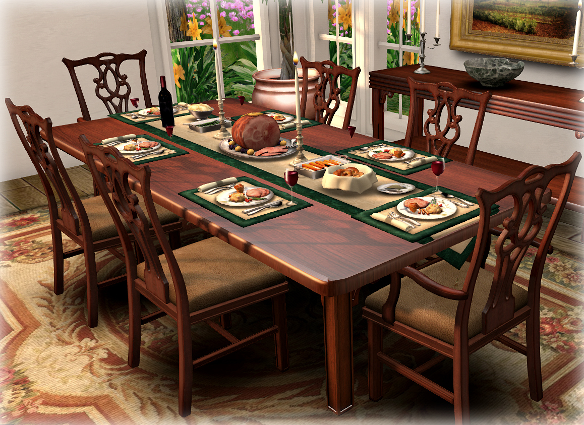 This dinner table will serve a lasagna, shrimp, steak or ham dinner with a glass of red wine, fried chicken with iced tea, eggs, bacon, and croissant, and for desert a round of cheesecake and coffee. When not serving, rez a variety of centerpieces.