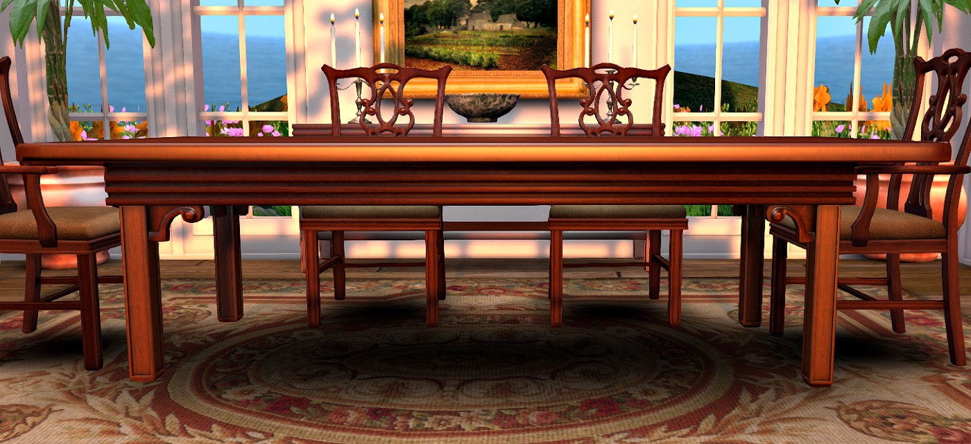 This week’s new release is this Mahogany Chippendale Dinner Party Set for 6, just in time for the upcoming holiday get togethers! 37 Prims/LI. Mod/Trans