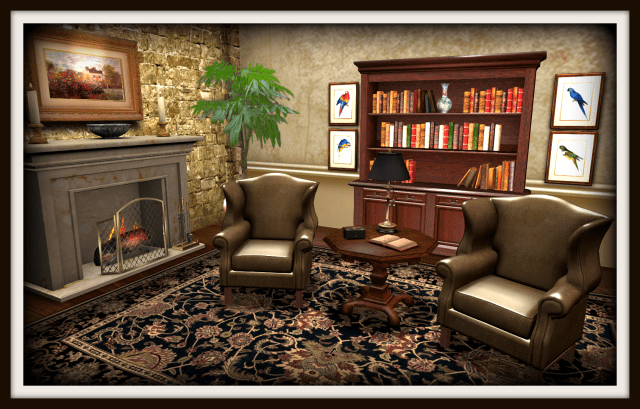 The La Galleria library set includes two copper leather wingchairs with reading animations (and book to read), octagonal pedestal table, marble fireplace, mahogany bookcase, lamp, and everything else in the picture!