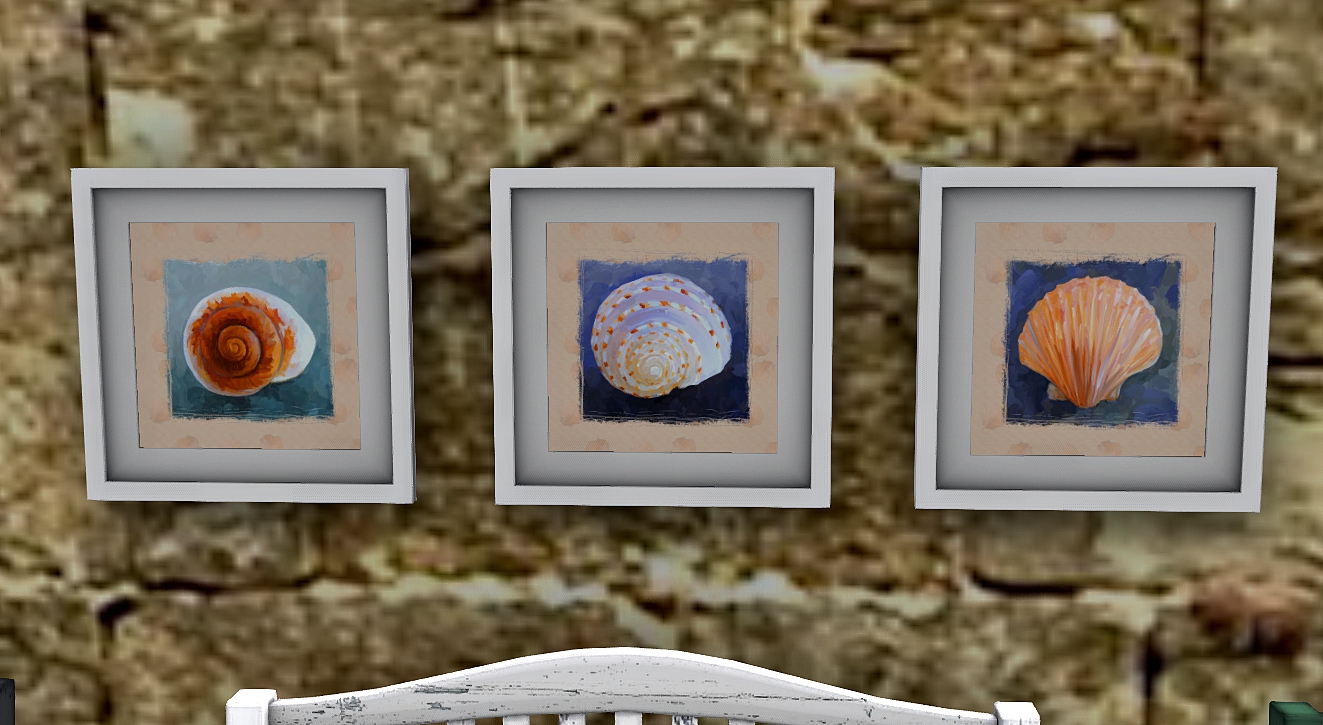 I am offering these pretty seashell pillows (1Prim) and these seashell pictures in size large and small (2 Prims). Copyable.